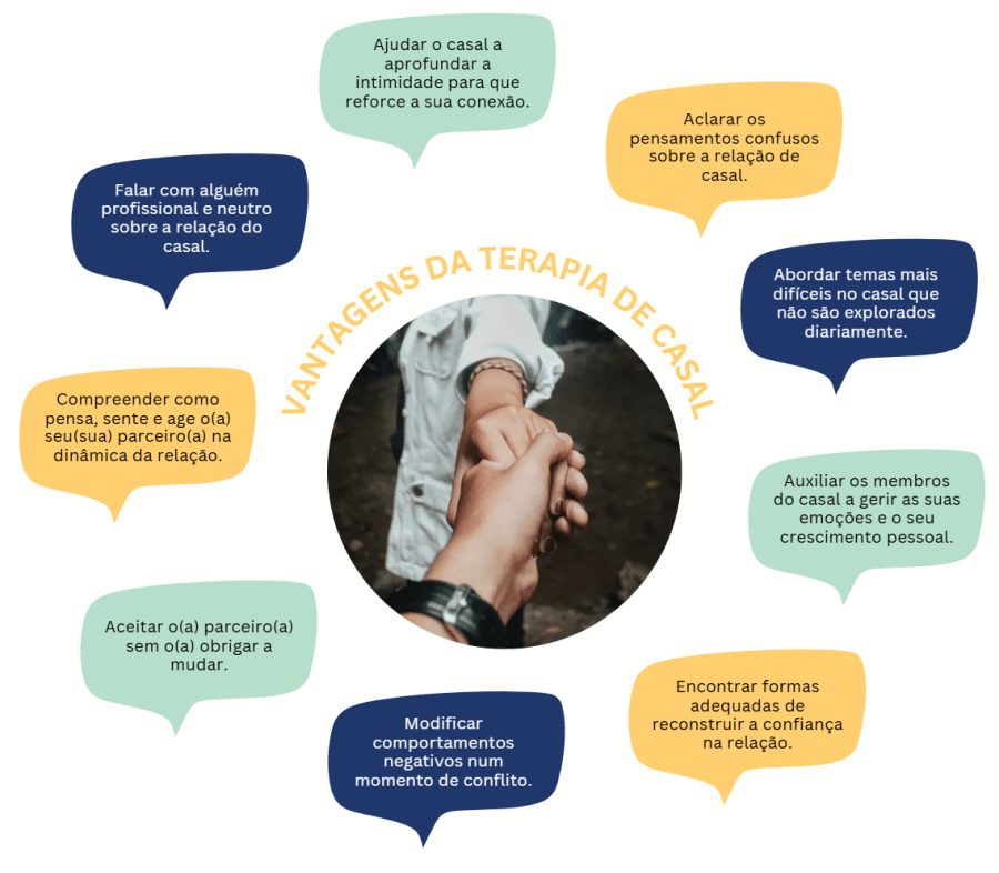 A Terapia de Casal é uma vertente da Psicologia que tem como objetivo geral ajudar o casal a identificar e a reconhecer os conflitos e as fragilidades entre si e que contribuem para uma relação insatisfatória.